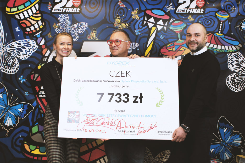 18 marca 2019 Hydrex Diagnostics przekazał Fundacji WOŚP czek na 7 733 zł. Kwota pochodziła zarówno ze zbiórek prywatnych pracowników jak i od samej firmy.